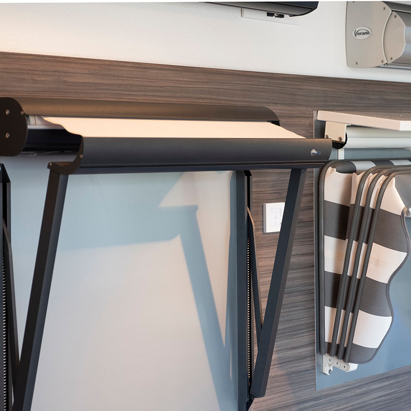 Een laatste veelgekozen verticale zonweringsoplossing is een uitvalscherm. Uitvalschermen vallen redelijk verticaal naar beneden voor het raam langs. In tegenstelling tot screens hebben uitvalschermen, zoals de naam al zegt, wel een uitval. Een uitvalscherm houdt warmte en schittering tegen, met behoud van zicht naar buiten. Leverbaar tot 23 meter breedte.