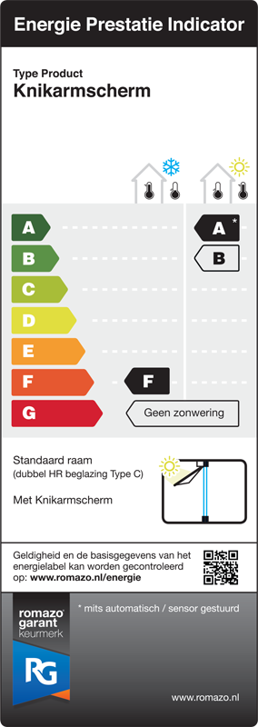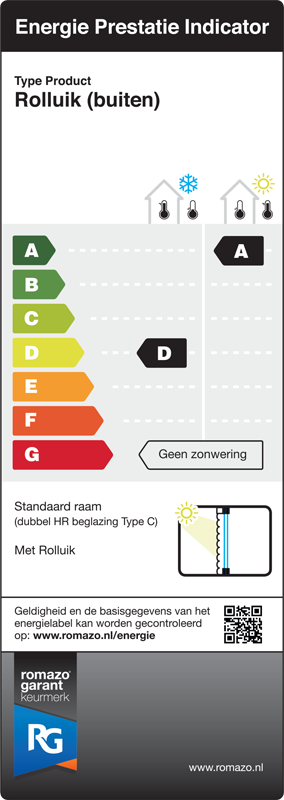 Zonder zonwering krijgt uw raam de Energie Prestatie Indicator “G”. Dit houdt in dat u maximaal warmte verliest binnen het stookseizoen, en maximaal warmte binnenhaalt buiten het stookseizoen. Met behulp van buitenzonwering kunt deze prestaties verbeteren en zo energie en kosten besparen. De Energie Prestatie Indicatoren variëren van A t/m G, waarbij A het beste is. Met het indelen van deze labels is uitgegaan van dubbele HR beglazing Type C.