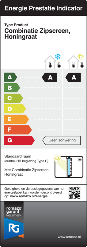 Van alle zonwering krijgt de combinatie van het zipscreen (buitenzonwering) met de Honingraat (binnenzonwering) de hoogste labeling. Deze combinatie scoort in zomer en winter label A.