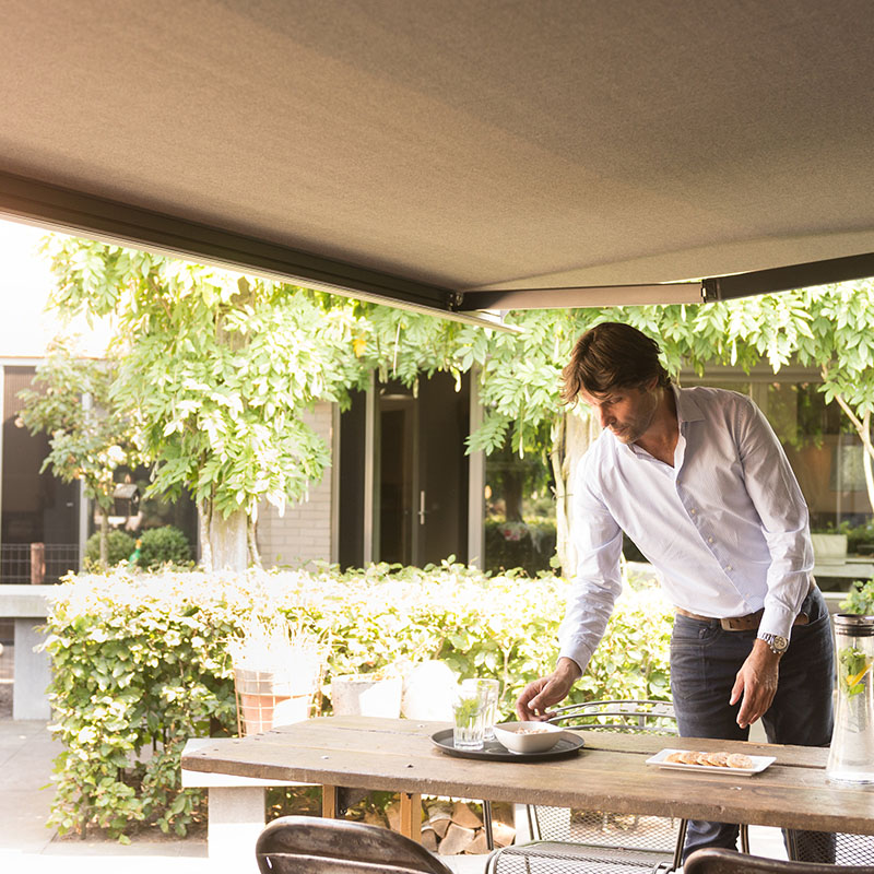 Knikarmschermen zorgen dat je buiten kan genieten, uit de zon en uit de warmte. Ze verbinden binnen met buiten. Ze zorgen voor een comfortabele plek om te ontspannen, te werken of te eten. Met een knikarm zonnescherm behoudt u de vrije doorloop naar het terras. Dat is elk moment van de dag genieten!